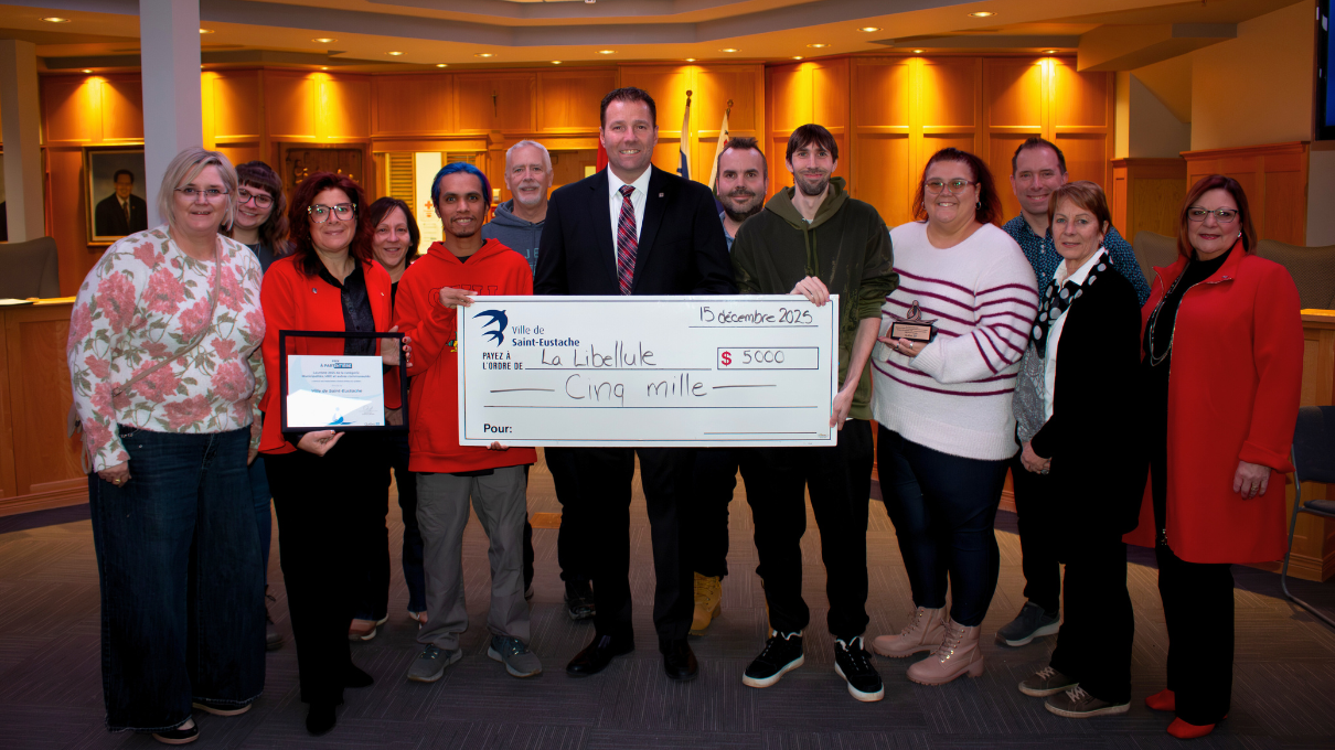 (Saint-Eustache, le 16 décembre 2025) – Aujourd’hui, la Ville de Saint-Eustache est heureuse de remettre une bourse de 5000 $ à l’organisme La Libellule, que la Ville a reçue dans le contexte de la réception du prix « À part entière », décerné à la Ville par l’Office des personnes handicapées du Québec le 18 novembre dernier.